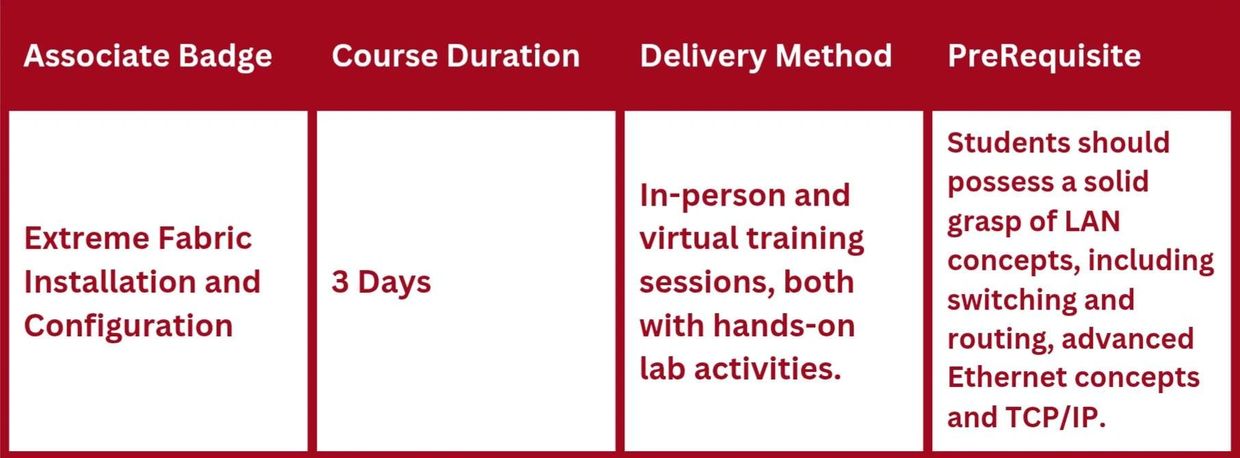 This course is designed as the first step for individuals responsible for the installation, configuration and management of the Extreme Networks family of Fabric switches.