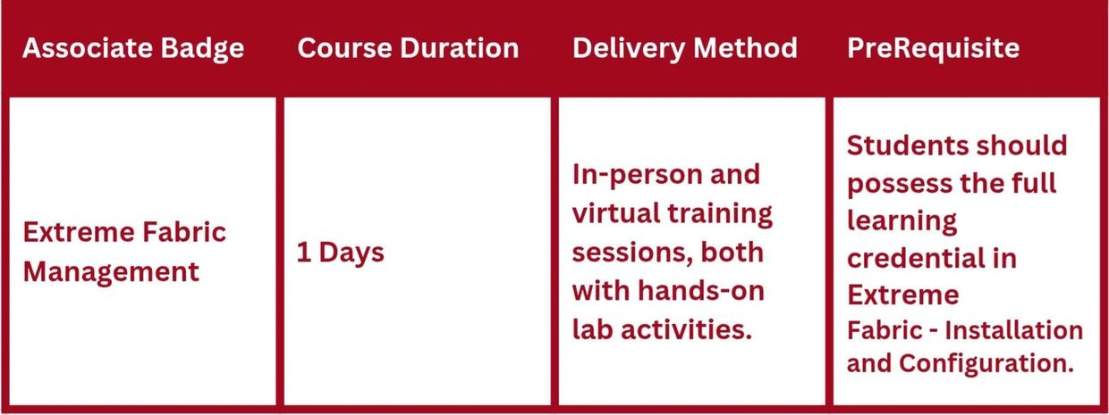 This course is designed for network administrators, engineers and integrators responsible for the configuration and management of the Extreme Networks Campus Fabric Connect switches