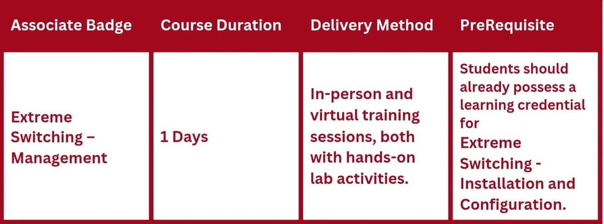 This course is aimed at individuals responsible for the management of the Extreme Networks family of ExtremeXOS/SwitchEngine switches.